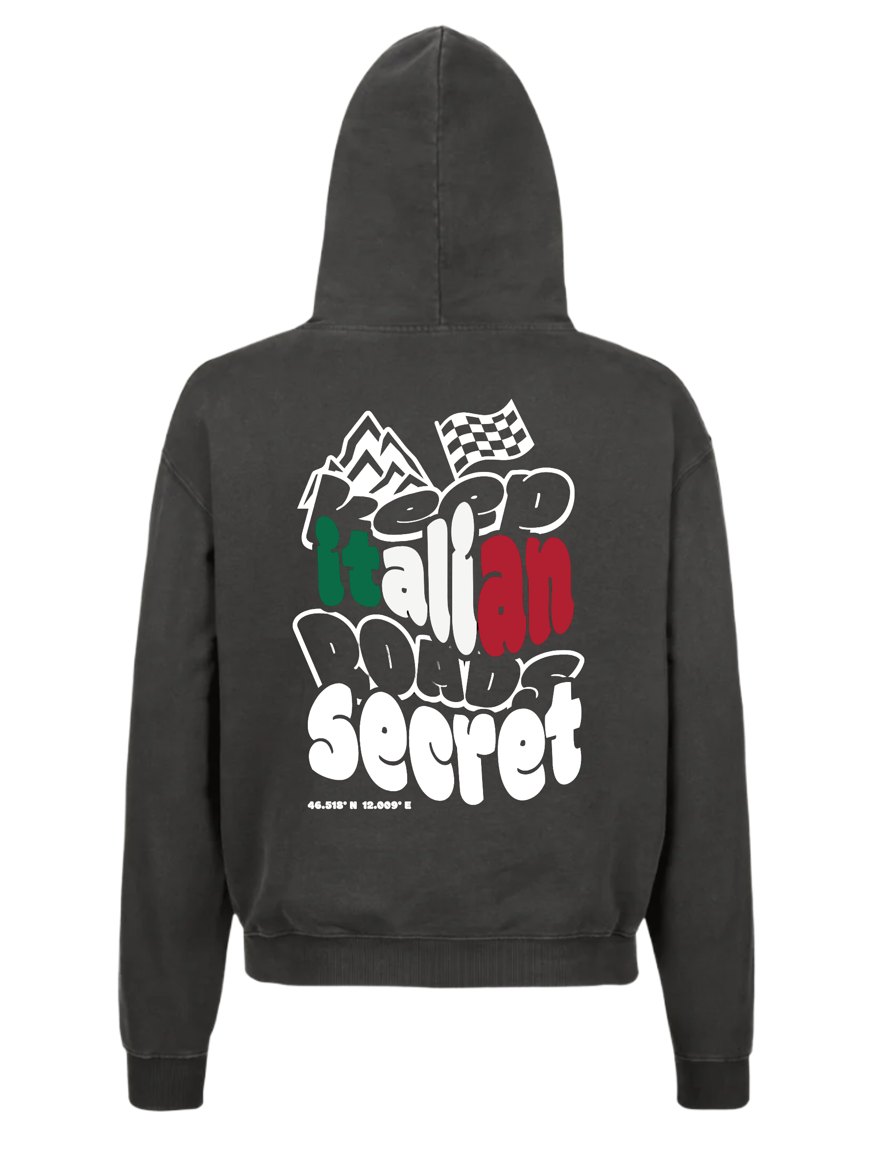 Der KEEP ITALIAN ROADS SECRET-Hoodie bringt das „KEEP ITALIAN ROADS SECRET“ Statement in eine oversized Silhouette – perfekt für Nächte in der Stadt und Fahrten Richtung Berge.